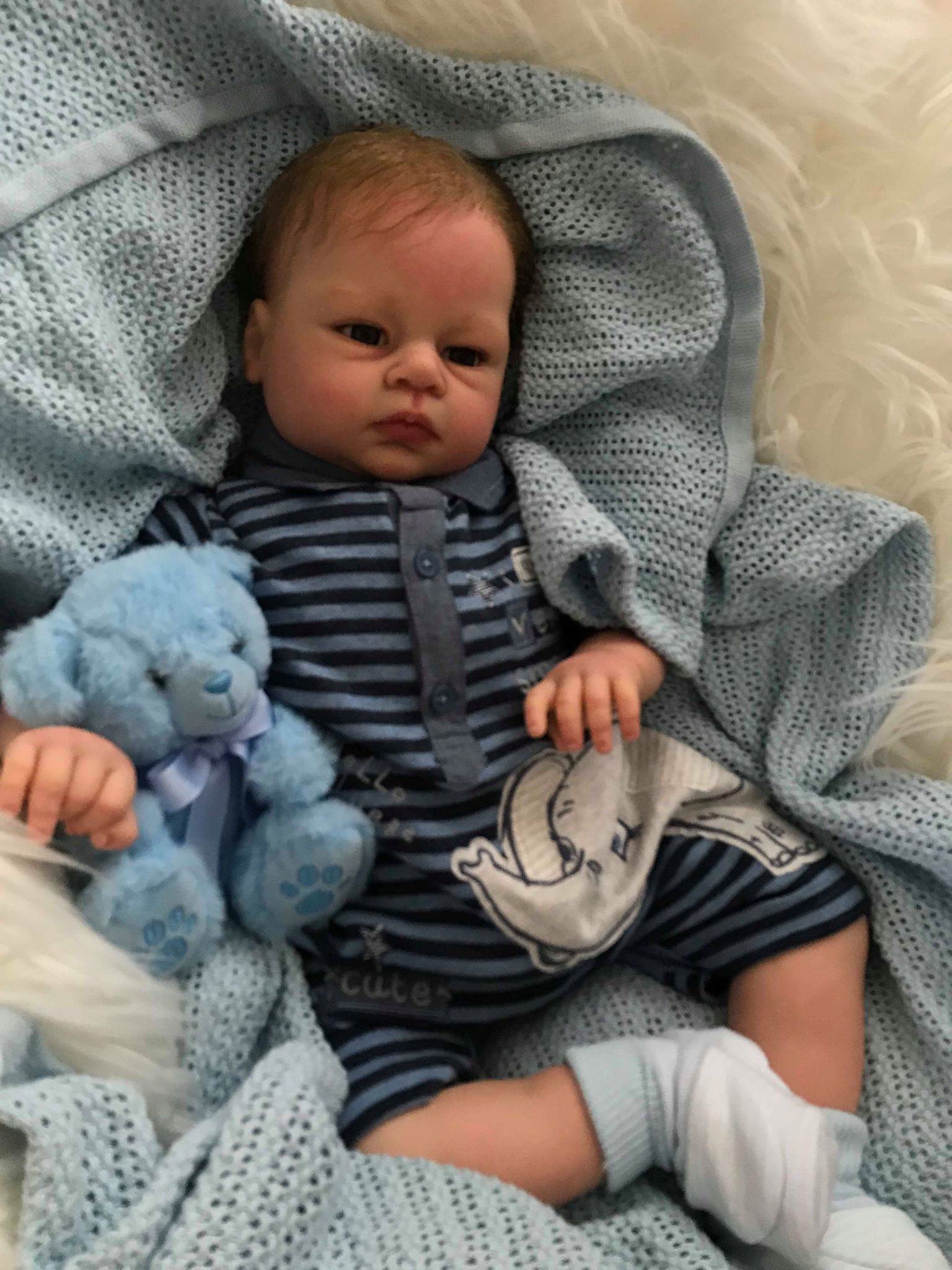 Jacob Open Eyes Reborn Doll is a beautifully hand painted reborn doll. Jacob open eyes has been hand painted using air dried paint and comes with a choice of hair colour. The Jacob Open Eyes Reborn Doll weighs around 10lbs and is 24 inches in length.Details:Vinyl head, arm and legsCloth Body6 month size (will fit 3/6 – 6/9 month size clothing depending on brand)Dressed in one outfit (cannot guarantee the same out fit as pictured)Birth CertificateMagnetic DummyPackaged in a plain brown boxOptional Extras:Gift box (see accessories section)Accessory pack (see accessories section)For BOX OPENING order your chosen doll gift box accessory packReborn Dolls are not recommended for young children.